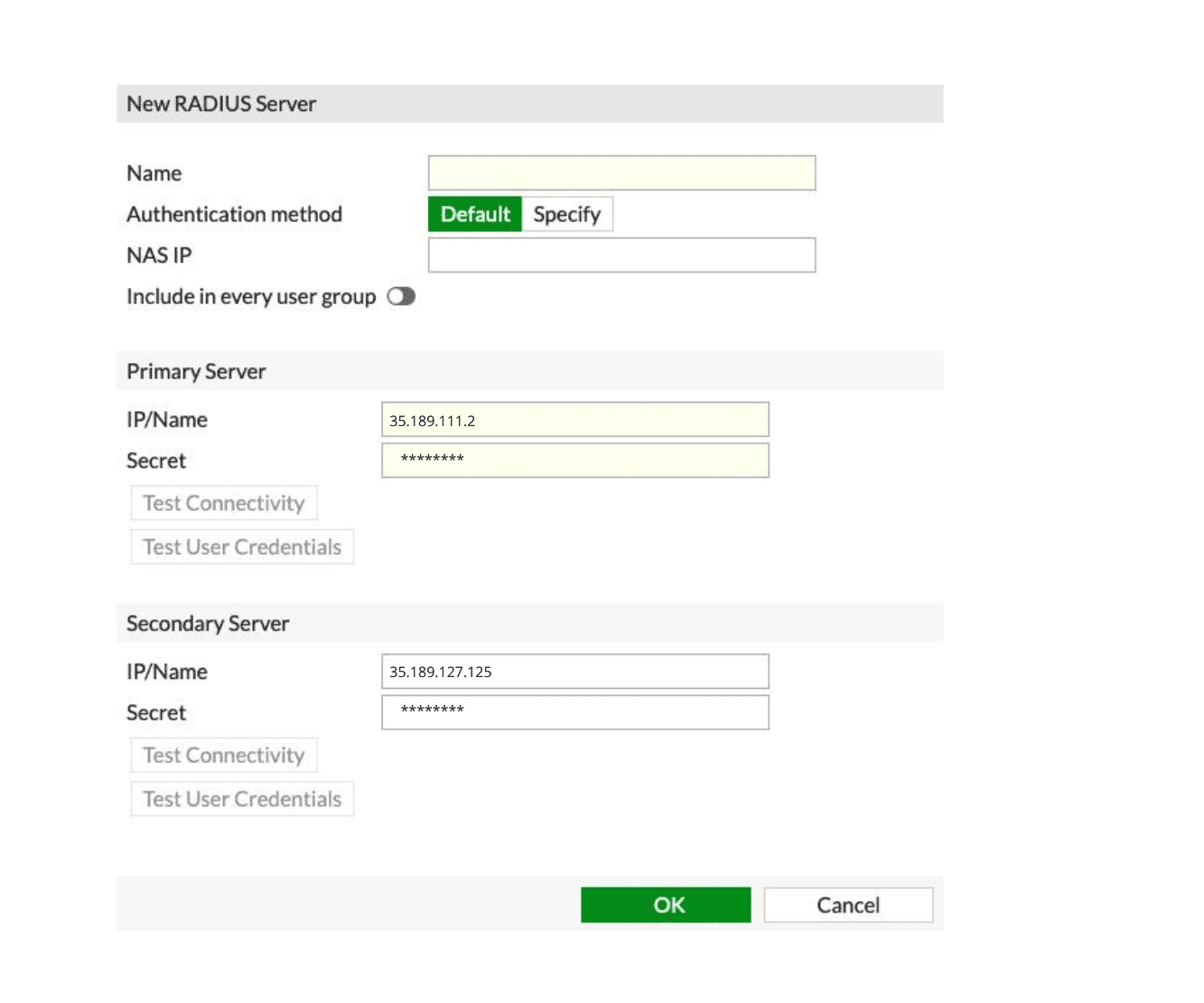 9. If there is a secondary RADIUS server, enter its RADIUS IP address and also the assigned RADIUS shared secret for Secret in the Secondary Server section.