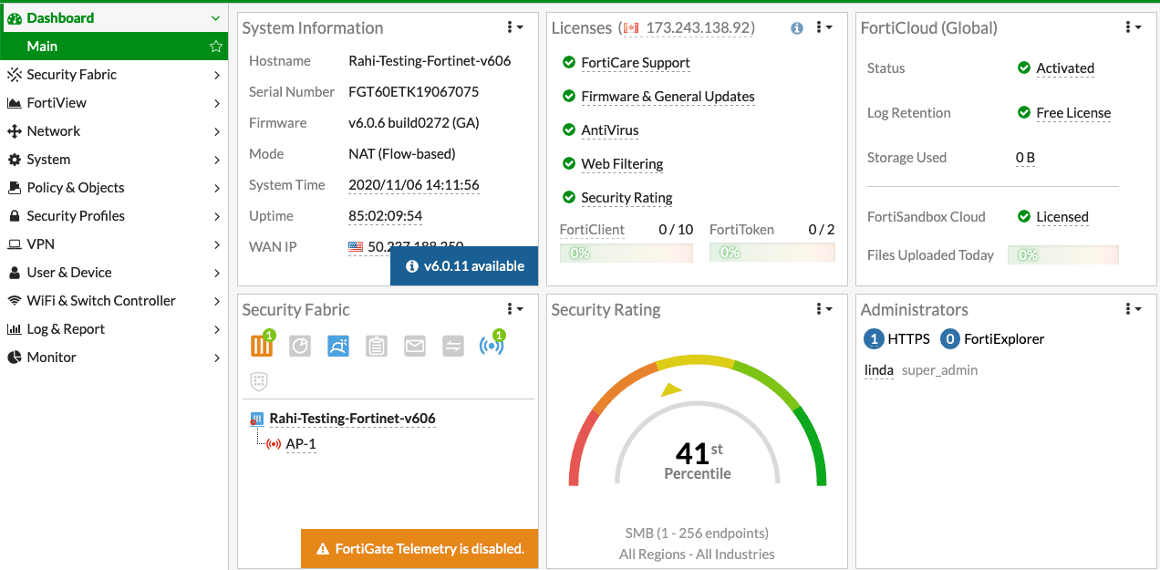 To start the configuration process, log in to the FortiGate Dashboard as admin. For existing
